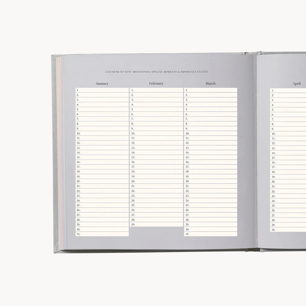 • A calendar for recording milestones, memorable moments, and significant events.