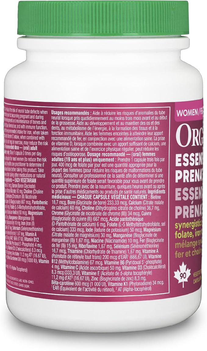 MEDICINAL INGREDIENTS - EACH VEGETARIAN CAPSULE CONTAINS: Biotin 16.7 mcg, Boron (Boron Glycinate) 233.33 mcg, Calcium (Calcium Citrate Malate) 60 mg, Choline (Choline Dihydrogen Citrate) 36.7 mg, Chromium (Chromium (III) Nicotinate Glycinate) 34 mcg, Copper (Copper (II) Bisglycinate) 667 mcg, Pantothenic Acid (Calcium D-Pantothenate) 6 mg, Folate (L-5-Methyltetrahydrofolate, Calcium Salt) 333 mcg, Iodine (Potassium Iodide) 50 mcg, Magnesium (Magnesium Citrate Malate) 30 mg, Manganese (Manganese (II) Bisglycinate) 1.67 mg, Niacin (Niacinamide) 10 mg, Iron (Iron (II) Bisglycinate) 15 mg, Riboflavin 1.67 mg, Selenium (Selenomethionine) 16.7 mcg, Thiamine (Thiamine Hydrochloride) 1.67 mg, Vitamin A (all-trans-Retinyl Palmitate) 200 mcg RAE1 (666.67 IU), Vitamin B12 (Methylcobalamin) 67 mcg, Vitamin B6 (Pyridoxal 5'-Phosphate) 4 mg, Vitamin C (Ascorbic Acid) 50 mg, Vitamin D3 (Cholecalciferol) 8.3 mcg (333.3 IU), Vitamin E (d-alpha Tocopheryl Acetate) 11.2 mg AT2 (16.67 IU), Zinc (Zinc Bisglycinate) 8.3 mg, Beta-Carotene 600 mcg (1000 IU), Vitamin K1 (Phytonadione) 34 mcg. 1 RAE (Retinol Activity Equivalents), 2 AT (Alpha-Tocopherol)